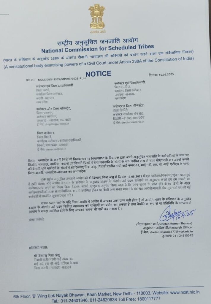 आयोग ने साफ कहा है कि यदि समय पर जवाब नहीं मिला, तो वह सिविल कोर्ट की तरह सभी कलेक्टरों को सम्मन जारी करेगा। आयोग ने आदिवासी भूमि की खरीद-फरोख्त से जुड़े सभी दस्तावेज भी तत्काल प्रस्तुत करने को कहा है।