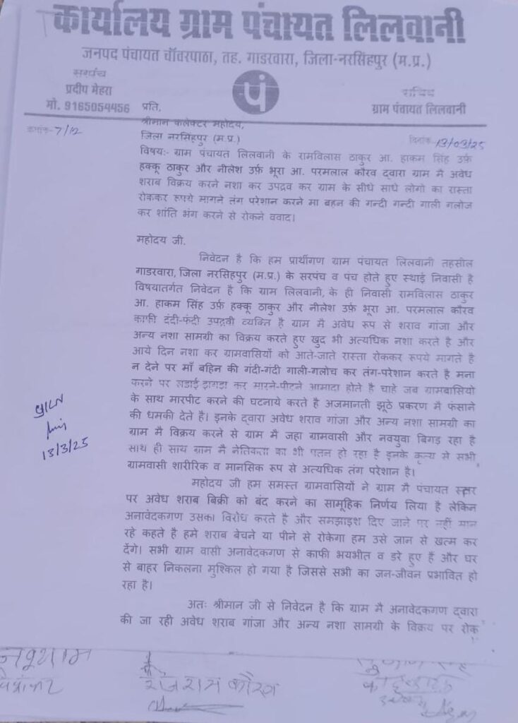 Despite a village resolution banning alcohol sales, illegal liquor trade continues in Gadarwara’s Lilwani village. When villagers protested, they received threats. A formal complaint has been filed with the police, demanding strict action against the culprits. The community remains united against illegal liquor sales, urging immediate administrative intervention.