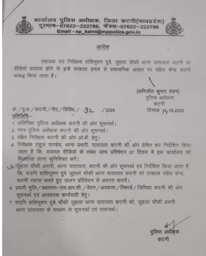 वीडियो को गंभीरता से लेते हुए कटनी पुलिस अधीक्षक अभिजीत कुमार रंजन ने तत्परता दिखाते हुए श्री दुबे को तत्काल प्रभाव से लाइन अटैच कर रक्षित केंद्र कटनी में संबद्ध कर दिया है।
