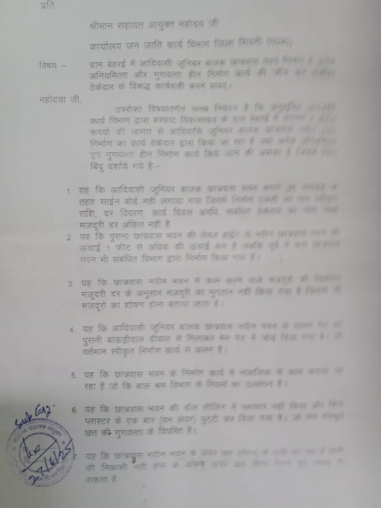ग्रामीणों ने जिला कलेक्टर से शिकायत करते हुए छात्रावास भवन के निर्माण कार्य पर रोक लगाने और उच्चस्तरीय जांच की मांग की है। स्थानीय लोगों का आरोप है कि विभागीय अधिकारियों की मिलीभगत से ठेकेदार को बचाया जा रहा है और पक्षपातपूर्ण जांच रिपोर्ट तैयार की जा रही है।