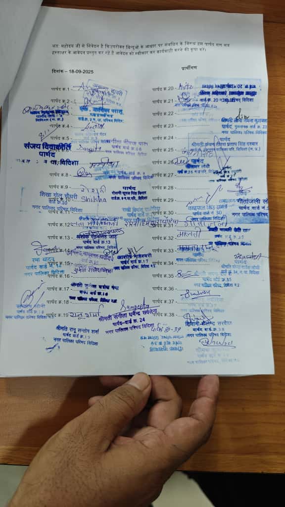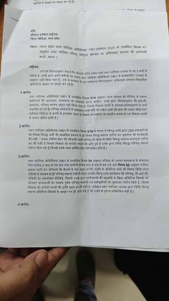 38 Vidisha Municipal Councilors united against Mayor Preeti Rakesh Sharma, alleging illegal recruitment, financial losses worth crores, and misuse of powers. The councilors met the Collector demanding accountability and action, exposing corruption and administrative irregularities in the city’s governance.